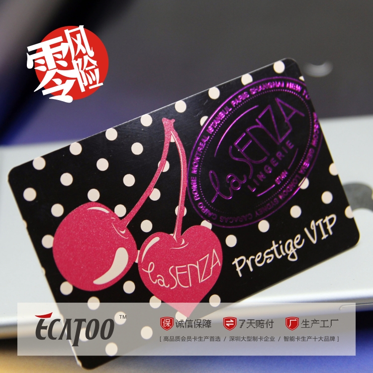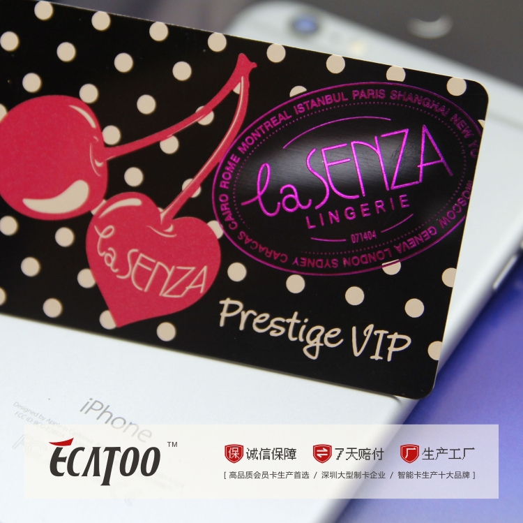 山国饮艺茶文化馆体验卡,客户要求金色的,有档次。我们采用了拉丝金材料,金属质感强,做出来有拉丝纹理强,视觉效果好,表面文字采用丝网印刷专色,表面双做UV处理,这样既能保证印刷颜色,文字又有立体感本卡为射频IC芯片,读写距离稳定,操作方便,客户体验好。