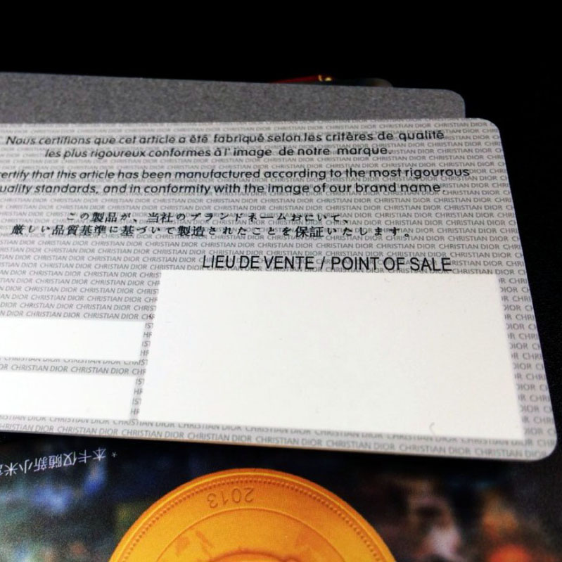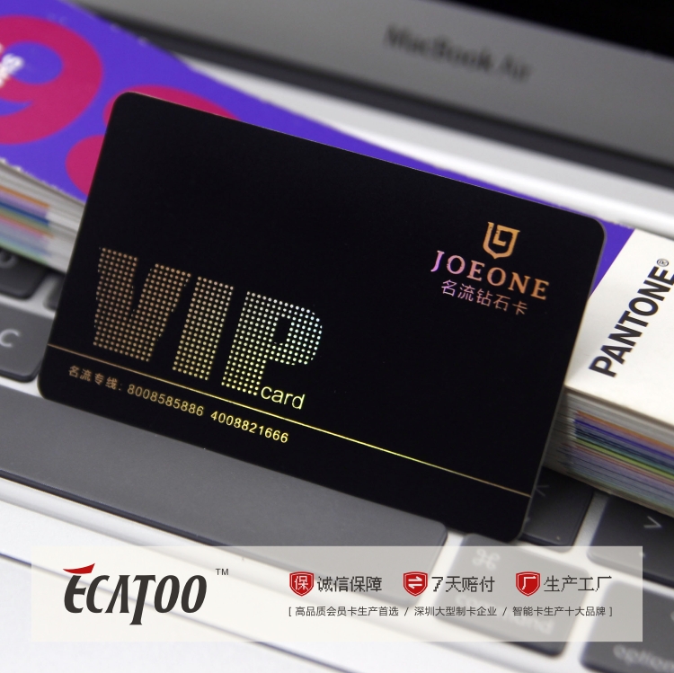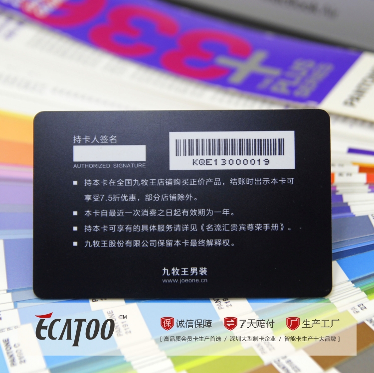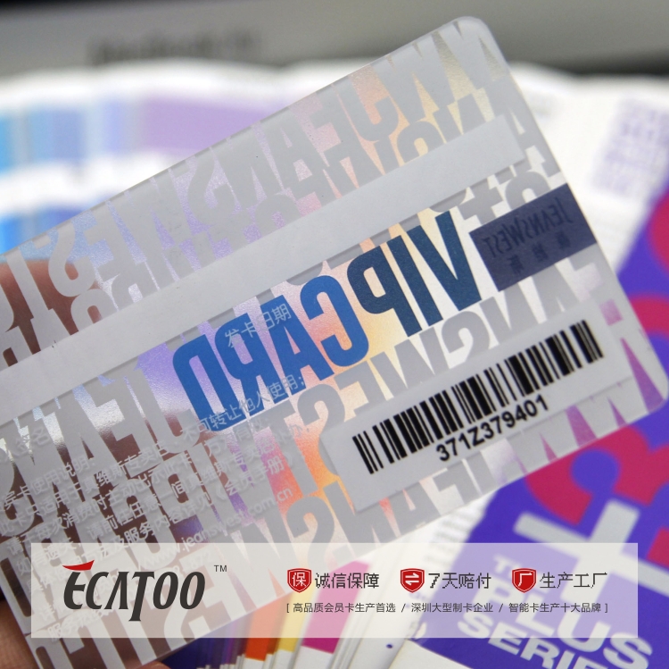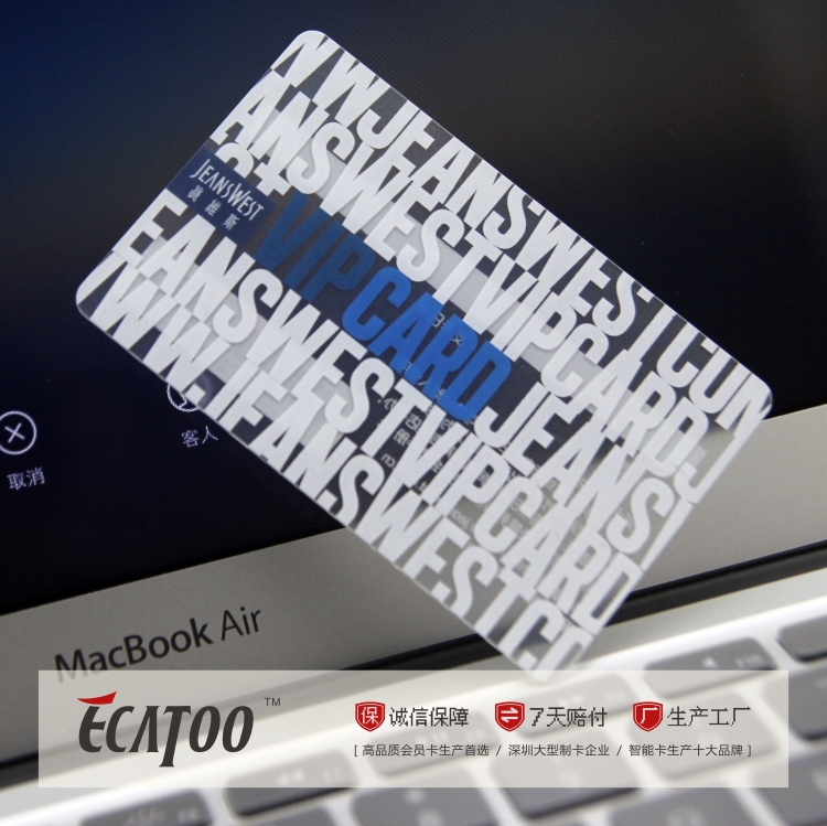 真维斯会员卡为全新透明料制作,正面JEANSWEST及VIP CARD的英文用丝印特白油墨,空隙处为透明效果,隐约能看到背面文字,其余蓝色也全部丝网印刷专色,丝网印刷的油墨颜料够厚不透底。背面文字及签字条印白色,喷黑色128型号条码。