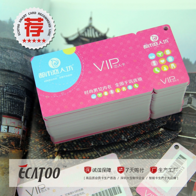 都市恋人坊是国内最专业、最实战、网点最多的大众平价内衣连锁机构;同时也是国内最早涉足平价内衣领域的企业,是中国平价内衣行业的发起者之一。恋人卡采用了子母卡的方式,可分离出两个卡来独立使用。印刷采用了公司的粉红为主色调,加入了珠光粉,时尚又不失高档。