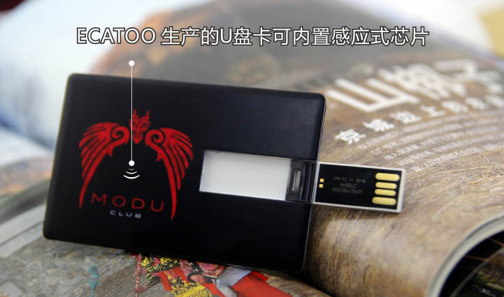 由ABS材料制成,外观和标准银行卡一样,内置U盘的卡片,长宽为85.5*54MM,厚度为1.2-2MM。亿卡通生产的U盘卡可内置感应式芯片,具有防伪作用及客户信息管理等功能。