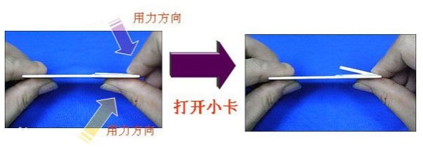 卡片U盘的使用方法其实很简单,虽然简单但还是有不少人不会使用。首先左手托住卡片U盘同时往上用力顶,右手以拇指用力往下压,详细请参考下图: