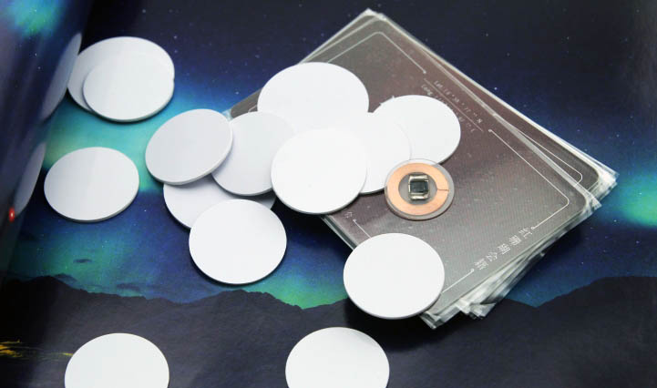 层压封装芯片和线圈的圆形射频卡,像硬币大小。置于物体内,起到防伪、识别等作用。如放于印章内。目前最小直径可以做到13mm。